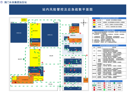 加壓站在站內(nèi)全面推行安全風險分級管控和隱患排查治理雙重預防機制,對作業(yè)現(xiàn)場可能存在的安全風險進行全面識別、評估和分級,同時制作風險四色圖和風險告知牌,將安全風險等級從高到低按區(qū)域依次劃分為重大、較大、一般和低風險,分別用紅、橙、黃、藍四種顏色標示,明確不同區(qū)域的風險等級、防范措施和相關(guān)責任人,以最直觀的方式展示作業(yè)現(xiàn)場的安全風險及防范措施。根據(jù)風險四色圖和風險告知牌外來人員能了解所處區(qū)域可能存在的風險,做好自身防護,施工人員則可以做好施工前的風險管控,降低作業(yè)過程中的安全風險。