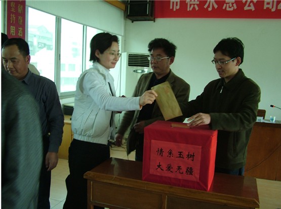 4月26日,荊門市供水總公司舉行“情系玉樹(shù) 大愛(ài)無(wú)疆“捐款活動(dòng),供水職工慷慨解囊、捐款踴躍,短短的時(shí)間,共募得善款18170元,圖為捐款現(xiàn)場(chǎng)場(chǎng)景。