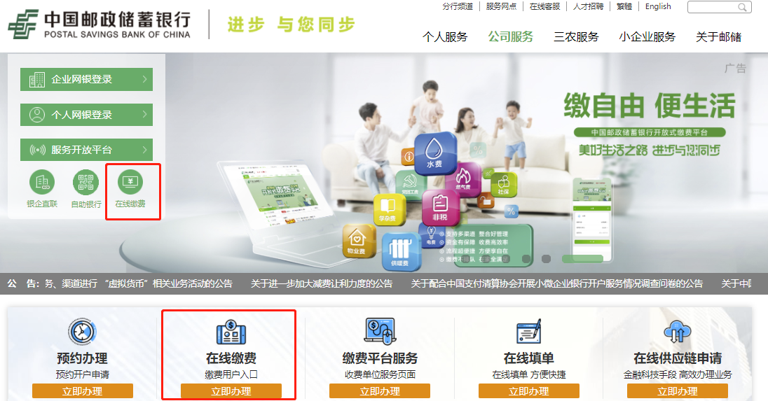 登錄繳費用戶登錄“中國郵政儲蓄銀行”官網(wǎng)(http://www.psbc.com/cn/),點擊“服務快捷通道-在線繳費”進入,無需注冊及登錄。