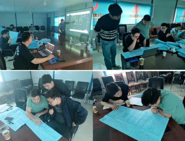 (小伙子們利用休息時間研究圖紙)