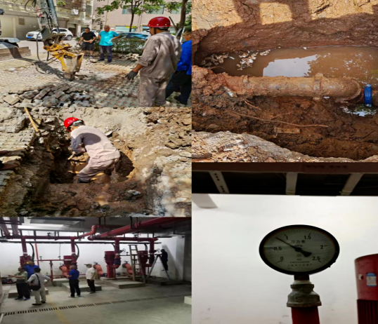 可正當(dāng)進(jìn)行試壓時(shí),小區(qū)消防控制中心卻傳來一個(gè)出人預(yù)料的“噩耗”,消防管網(wǎng)壓力居然為0,隱患仍未消除!看著滿身疲憊的“戰(zhàn)友們”,王經(jīng)理鼓勁到“大家先休息,我們?cè)賮硐朕k法。”集團(tuán)相關(guān)部門獲悉情況后,由生產(chǎn)安全部攜手營抄中心和潤澤公司等多家單位,主動(dòng)參與會(huì)戰(zhàn),同時(shí)致電消防部門給與技術(shù)指導(dǎo)。
