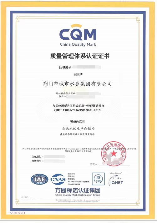 圖為市水務(wù)集團(tuán)通過質(zhì)量管理體系認(rèn)證
