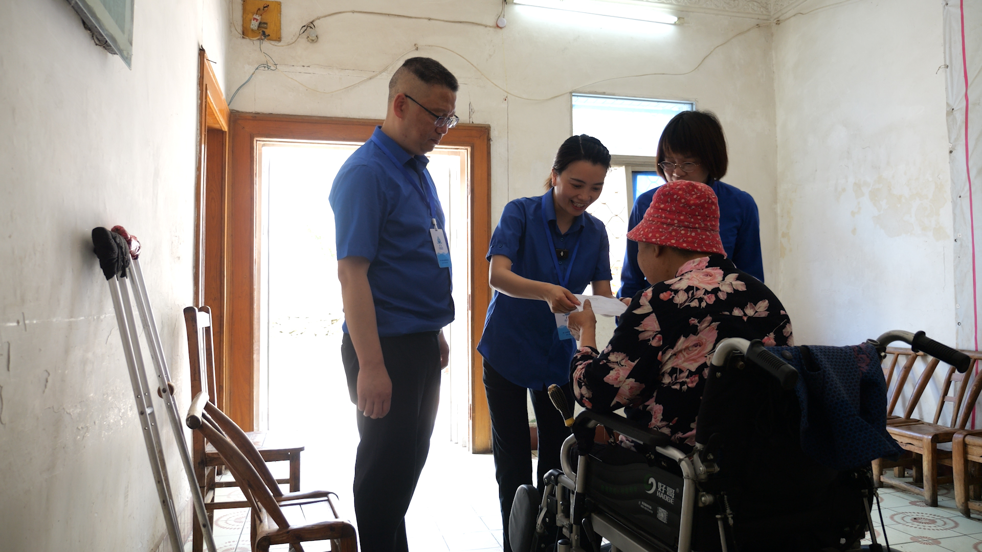 圖為水務(wù)集團工作人員為出行困難老人送水費發(fā)票。