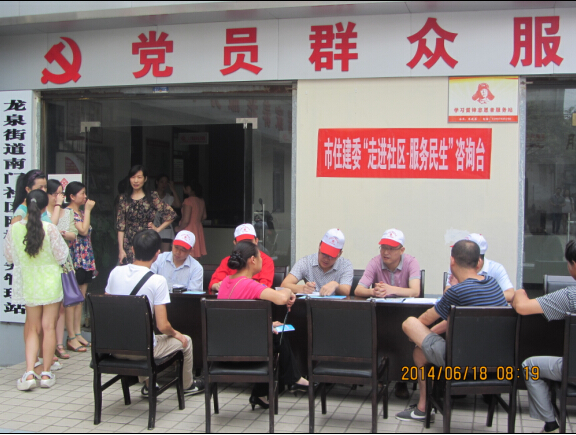 市供水總公司黨委書記陳永根(左二)在“走進(jìn)社區(qū)、服務(wù)民生,走進(jìn)企業(yè)、服務(wù)發(fā)展”活動中,深入龍泉街辦南門社區(qū)傾聽用戶呼聲,辦實事,解難題。