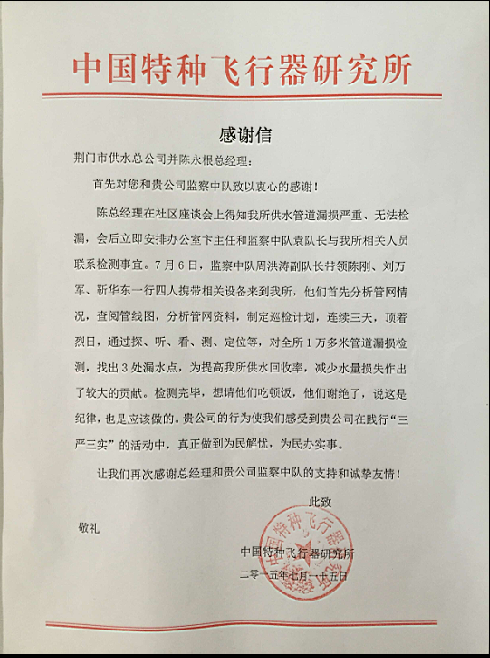 7月28日,605所相關負責人一行2人專程到公司送上“全心全意服務企業(yè)”錦旗和一封感謝信,表達公司免費為其探測漏、減少其水量損失的謝意。