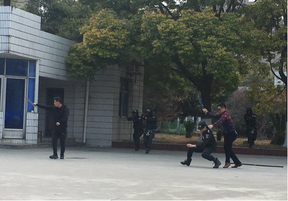 本次演練以在全國“兩會”召開前夕,2名暴恐份子密謀在市供水總公司三水廠采取投毒方式實(shí)施暴恐襲擊為背景展開。市公安局指揮中心接到水廠員工報(bào)案,2名暴恐份子駕車攜帶劇毒氰化物和匕首來到三水廠,密謀投毒、傷人。市公安局指揮中心立即派轄區(qū)派出所和巡邏組前往處置。在投毒失敗后,嫌疑人刺傷安保人員并挾持人質(zhì),與民警對峙。隨后,市公安局迅速啟動(dòng)反恐防范一級響應(yīng),調(diào)派轄區(qū)分局、巡特警、刑偵、交警等部門趕赴現(xiàn)場開展工作。短短3分鐘,暴徒迅速被控制,其中有一名暴徒被當(dāng)場擊斃,人質(zhì)被成功解救。之后,120急救中心趕往現(xiàn)場救治,同時(shí)環(huán)境監(jiān)測部門迅速開展水質(zhì)檢測評估,確保水廠供水安全。至此,反恐防暴演練活動(dòng)順利結(jié)束。