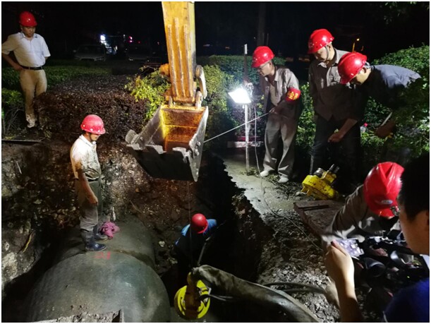 整個搶修工作安排在15日夜間11時至16日零晨6時進行。由于爆管段位于掇刀區(qū)白石坡“白石”較多地段,機械開挖到一定程度后,施工基坑內(nèi)管道底部只能用人工進行掏挖,一度給搶修工作造成極大困難。在搶修人員帶水作業(yè)頑強奮戰(zhàn)、不斷努力下,經(jīng)過18個小時的晝夜搶修,在16日零晨4點搶修完畢,按市供水總公司對社會服務(wù)承諾時間,于早上6時如期恢復(fù)供水。