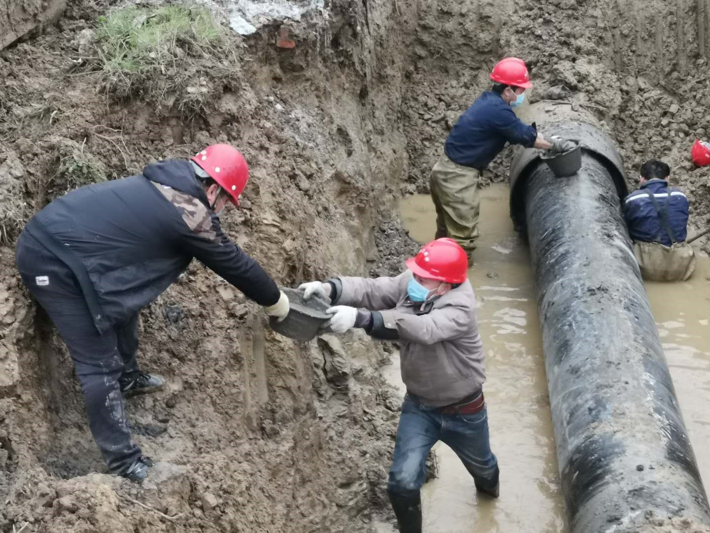 2月23日10時(shí),掇刀區(qū)迎春大道人福藥業(yè)門前DN600mm主供水管道突發(fā)爆管,供水維修部門迅速啟動(dòng)疫情期間應(yīng)急搶修預(yù)案,組織人員、工程機(jī)械、維修設(shè)備趕赴現(xiàn)場(chǎng),經(jīng)過9個(gè)多小時(shí)的緊張搶修,于當(dāng)日晚7點(diǎn)42分恢復(fù)了供水。緊接著次日8點(diǎn),東寶區(qū)科陽(yáng)路DN600mm主供水管道突發(fā)爆管,巡查人員現(xiàn)場(chǎng)核實(shí)后迅速止水,并及時(shí)通告用戶停水信息后開始倒閘排水,到13時(shí)左右開挖出爆管的DN600的主供水管道出現(xiàn)在大家面前,相比前日的搶修,整段水管因裂口較大損壞嚴(yán)重,不能簡(jiǎn)單修復(fù),只能現(xiàn)場(chǎng)立即制定可靠的管道更換維修方案。當(dāng)時(shí),全部工作人員從早上到現(xiàn)場(chǎng)已經(jīng)工作了5個(gè)小時(shí),滴水未進(jìn),但大家為保障搶修進(jìn)度,仍然堅(jiān)持一邊加班加點(diǎn)對(duì)基坑進(jìn)行處理,一鼓作氣將破損管道清理出來,做好對(duì)接管道的清淤工作。另一邊搬運(yùn)快干水泥,切割、加工、運(yùn)輸、吊裝管道,14點(diǎn)35分把全部材料物資運(yùn)抵現(xiàn)場(chǎng)開始作業(yè)。隨后,大家在泥地里匆匆啃了幾口方便面后,又投入到緊張的搶修工作中,終于在18點(diǎn)17分完成了維修,待水泥養(yǎng)護(hù)好后,于21點(diǎn)27分通水,及時(shí)保障了科陽(yáng)路企業(yè)和周邊居民的正常生產(chǎn)生活用水。
