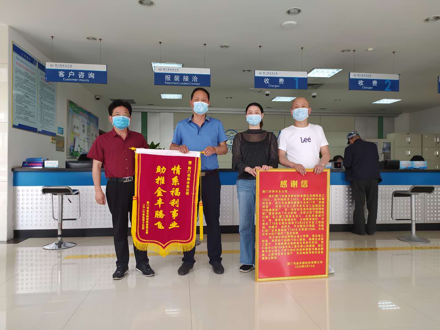 5月15日,金豐公司總經(jīng)理袁家群和東寶區(qū)工商聯(lián)相關(guān)負(fù)責(zé)人來到市供水總公司,送上感謝信和寫有“情系福利事業(yè) 助推金豐騰飛”字樣的鮮艷錦旗。