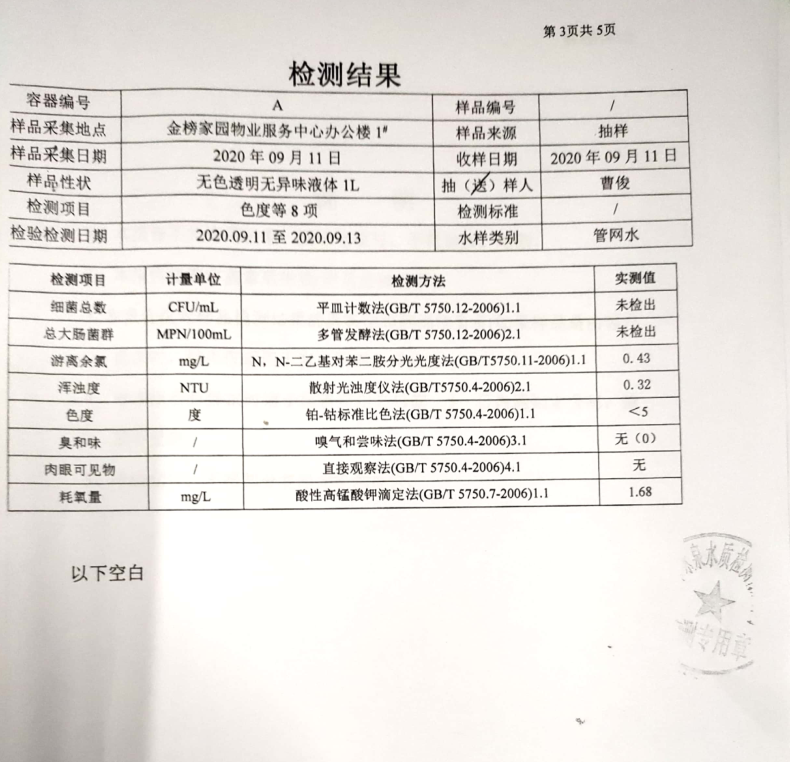 本著“用戶至上”的服務(wù)宗旨,為徹底消除用戶對(duì)荊城自來水水質(zhì)問題的疑慮,檢測(cè)人員再次進(jìn)行現(xiàn)場(chǎng)抽樣,并將水樣送至有相關(guān)檢驗(yàn)檢測(cè)資質(zhì)的第三方檢測(cè)機(jī)構(gòu)—荊門市詠泉水質(zhì)檢測(cè)有限公司進(jìn)行檢測(cè)。檢測(cè)結(jié)果顯示該用戶家中自來水各項(xiàng)指標(biāo)均符合《生活飲用水衛(wèi)生標(biāo)準(zhǔn)》(GB5749-2006)。具體檢測(cè)項(xiàng)目及結(jié)果見下圖: