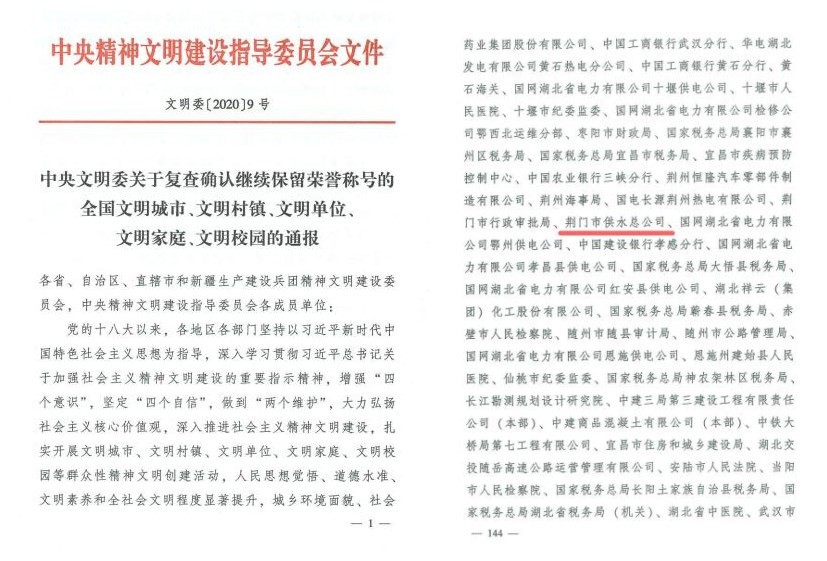 據(jù)悉,“全國文明單位”稱號是中央文明委授予創(chuàng)建單位的最高榮譽(yù)。市供水總公司繼續(xù)保留榮譽(yù)稱號,是企業(yè)文明單位創(chuàng)建活動扎實推進(jìn)、創(chuàng)新發(fā)展的一大豐碩成果。公司連續(xù)十一屆被省委、省政府授予省級文明單位,連續(xù)十二屆被市委、市政府授予市最佳文明單位,2017年被中央文明辦授予“全國文明單位”。2018年,在市消費者委員會發(fā)起的公服企業(yè)滿意度調(diào)查中,公司總成績排名第一,被授予“消費者滿意單位”和“消費者滿意品牌”。2019年,由于成功推行卓越績效管理和用戶滿意管理,被市政府評選為第七屆荊門市“市長質(zhì)量獎”獲獎企業(yè);因全面推進(jìn)依法治企,被評為湖北省省級“法治建設(shè)示范企業(yè)”;被荊楚網(wǎng)表彰為“全省優(yōu)秀政務(wù)微信公眾號”;作為全國唯一一家供水企業(yè),榮獲2019年全國市場質(zhì)量信用AA等級“用戶滿意企業(yè)”稱號。2020年,公司先后被評為荊門市建設(shè)江漢平原振興發(fā)展示范區(qū)先進(jìn)集體,在全市要素保障類滿意度測評中繼續(xù)名列榜首。三水廠團(tuán)支部被共青團(tuán)中央表彰為“全國五四紅旗團(tuán)支部”。詠泉水質(zhì)檢測有限公司曹俊同志榮獲“全市優(yōu)秀共產(chǎn)黨員”和“荊門市抗擊新冠肺炎疫情先進(jìn)個人”榮譽(yù),供水維修班長黃磊獲評“荊門好人·最美逆行者”榮譽(yù)稱號,加壓站員工閆寒家庭榮獲2020年“最美家庭”榮譽(yù)稱號。